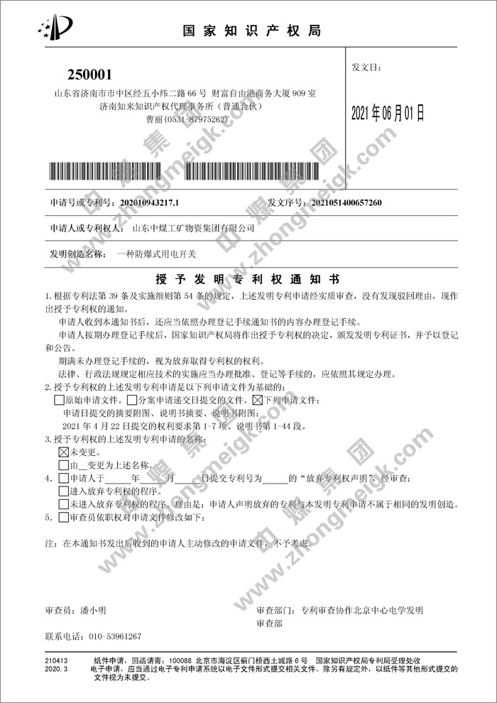 近日,由中煤集团制造总公司自主研发生产的“一种防爆式用电开关”、“一种矿用粉尘浓度传感器、传感器系统及方法”、“一种新型液压支柱”3项发明专利产品成功获得国家知识产权局授权,并取得“授予发明专利权通知书”。这是我集团在智能装备和工业互联网技术创新领域的又一突破,标志着集团的研发能力又跃上了一个新的台阶,为推动企业高质量发展提供了有力支撑。
