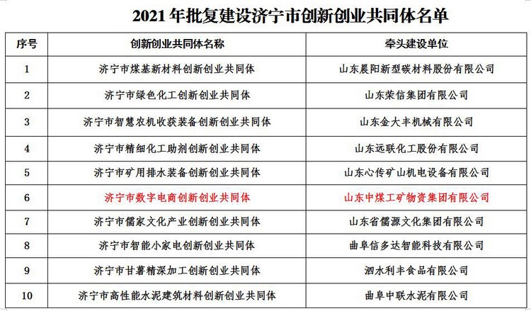 根据《济宁市创新创业共同体建设与运行管理办法》(济科字〔2020〕22号),近日,济宁市科技局公布了全市10家获批建设的济宁市创新创业共同体名单。其中,由山东中煤工矿物资集团有限公司牵头建设的济宁市数字电商创新创业共同体位列其中。